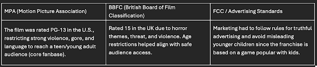 Since I’ll probably be using this same case study again this year, adding this part early makes it much more complete and A Level ready. I looked into content ratings like the PG 13 in the U.S. and the 15 rating in the UK, which were both important in shaping how the film could be marketed and who it was made for. I also learned how the marketing had to be careful not to directly target kids, even though the original FNaF game has a younger fanbase. Plus, I found out that on set production had to follow health and safety laws too.